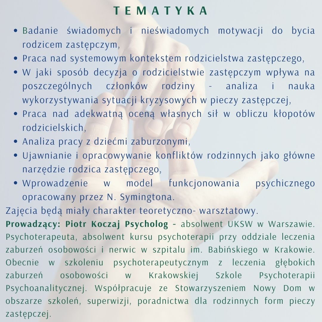Spotkanie poprowadzi: Prowadzący – Piotr Koczaj Psycholog, absolwent Uniwersytetu Kardynała Stefana Wyszyńskiego w Warszawie. Psychoterapeuta, absolwent kursu psychoterapii przy oddziale leczenia zaburzeń osobowości i nerwic w szpitalu im Babińskiego w Krakowie. Obecnie w szkoleniu psychoterapeutycznym w zakresie leczenia głębokich zaburzeń osobowości w Krakowskiej Szkole Psychoterapii Psychoanalitycznej. Doświadczenie pracy w Domu Pomocy Społecznej dla osób z niepełnosprawnością intelektualną. Obecnie kierownik mieszkań wspomaganych dla osób bezdomnych w Krakowie. Współpracuje od lat ze Stowarzyszeniem Nowy Dom w obszarze szkoleń, superwizji, poradnictwa dla rodzinnych form pieczy zastępczej, Prowadzi praktykę psychoterapeutyczną.