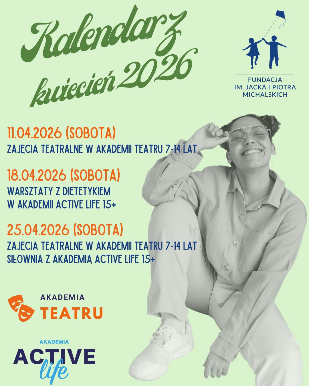Zachęcamy do zapoznania się z kwietniowym kalendarzem i planowania terminów na zajęcia w Akademii Active Life i Akademii Teatru. Przed nami: