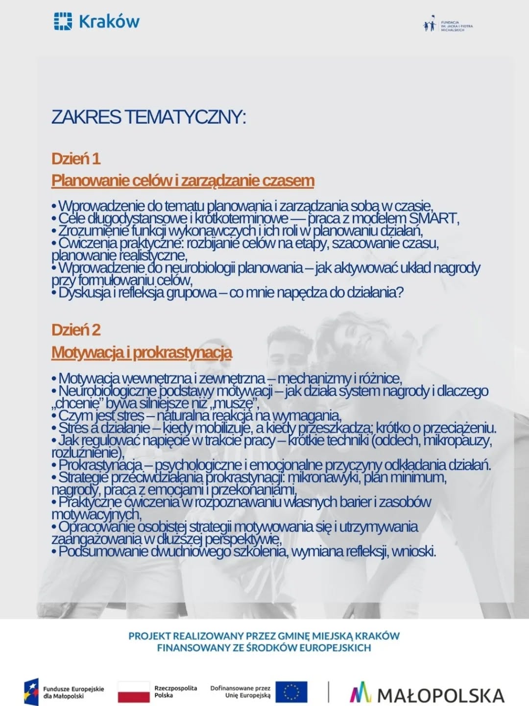 W dniach 6-7 grudnia 2025 r. odbędzie się SZKOLENIE z motywacji wewnętrznej i planowania działań pn. „Od zamiaru do działania: jak planować i utrzymać motywację”, organizowane przez Fundację im. Jacka i Piotra Michalskich w ramach zadania publicznego pt.: „Kompleksowe wsparcie młodzieży w procesie usamodzielnienia”. Projekt jest realizowany przez Gminę Miejską Kraków finansowany ze środków europejskich.